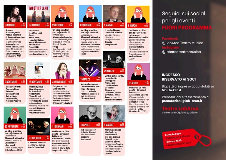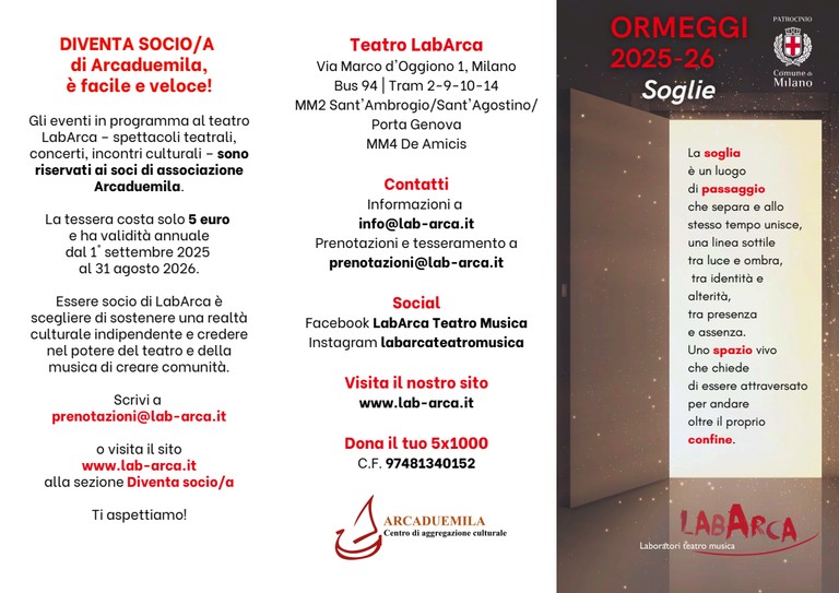 Ti ricordiamo che gli eventi in programma – spettacoli teatrali, concerti, incontri culturali – sono riservati ai soci di associazione Arcaduemila che gestisce e produce la stagione teatrale e musicale presso il teatro LabArca. Per questo, ti invitiamo a rinnovare o sottoscrivere la tua tessera associativa e non perdere neanche un appuntamento. |